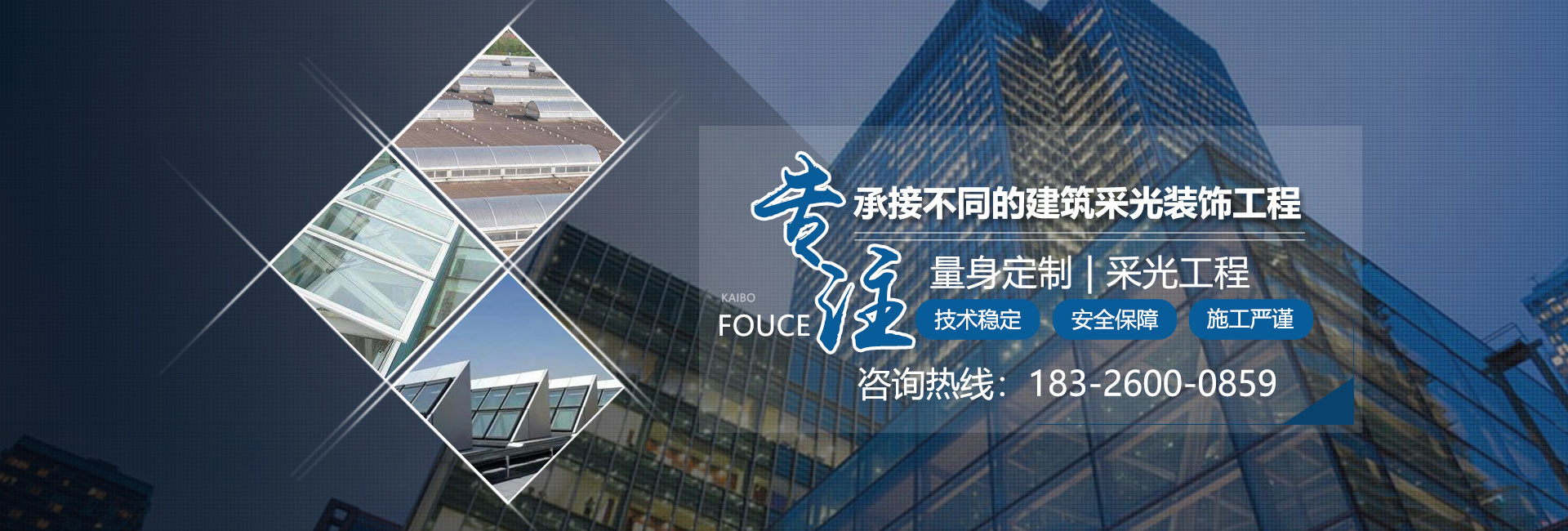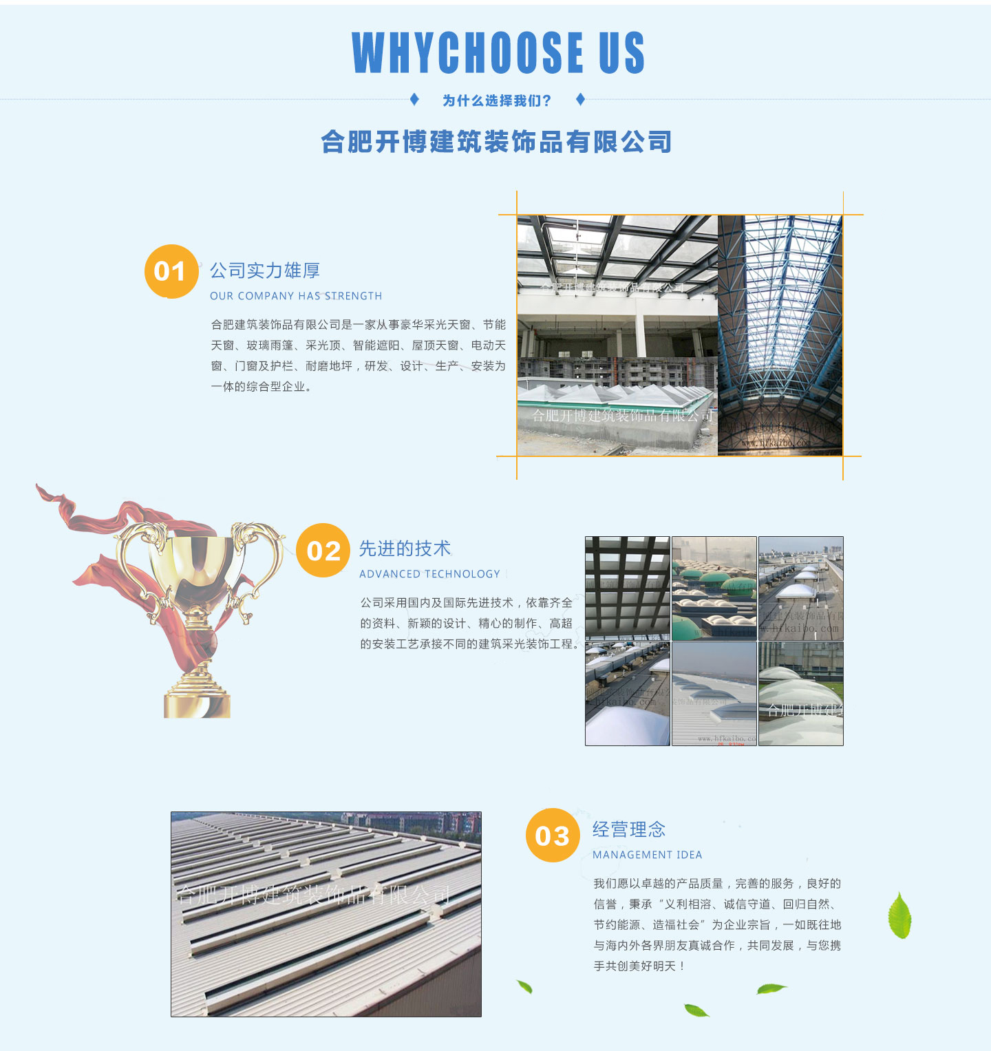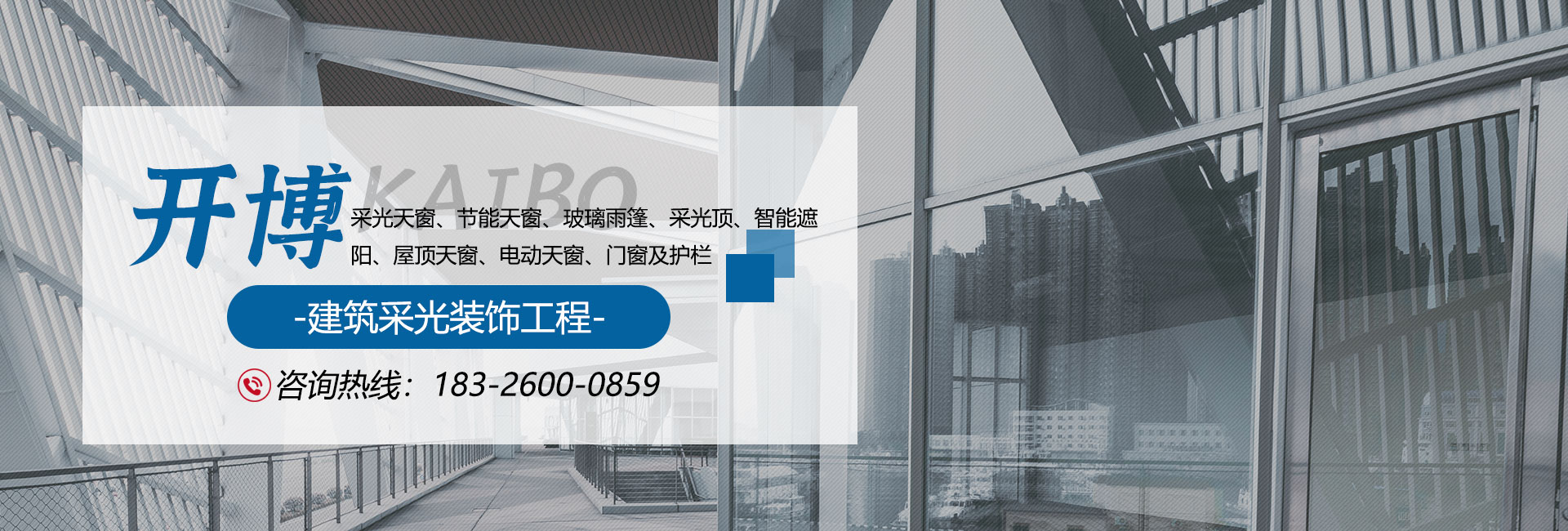 合肥開博建筑裝飾品有限公司是一家從事豪華采光天窗、節能天窗、玻璃雨篷、采光頂、智能遮陽、屋頂天窗、電動天窗、門窗及護欄、耐磨地坪,研發、設計、生產、安裝為一體的綜合型企業。公司座落于承東啟西、貫通南北的安徽省省會合肥。公司采用國內及先進技術,依靠齊全的資料、新穎的設計、精心的制作、高超的安裝工藝承接不同的建筑采光裝飾工程。我們愿以很好的產品質量,完善的服務,良好的信譽,秉承“義利相溶、誠信守道、回歸自然、節約能源、造福社會”為企業宗旨,一如既往地與海內外各界朋友真誠合作,共同發展,與您攜手共創美好明天!